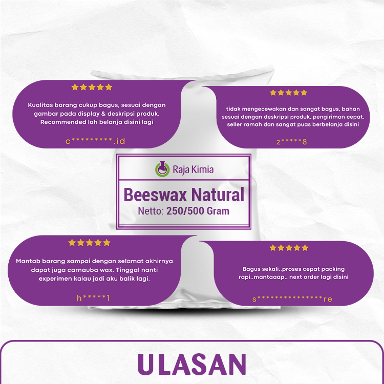 Beeswax Natural adalah lilin alami yang dihasilkan oleh lebah madu, murni dan bebas dari bahan kimia tambahan. Produk ini memiliki aroma khas madu yang lembut dan tekstur padat namun mudah dilelehkan, sehingga sangat serbaguna untuk berbagai keperluan.