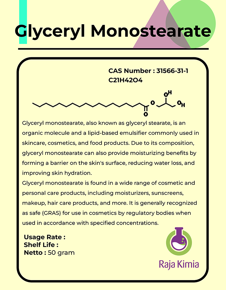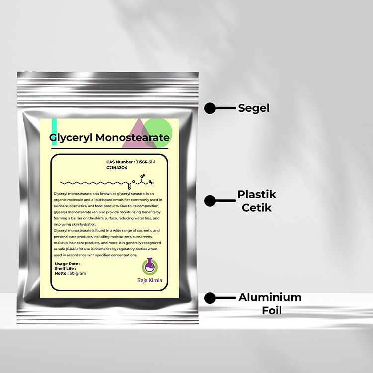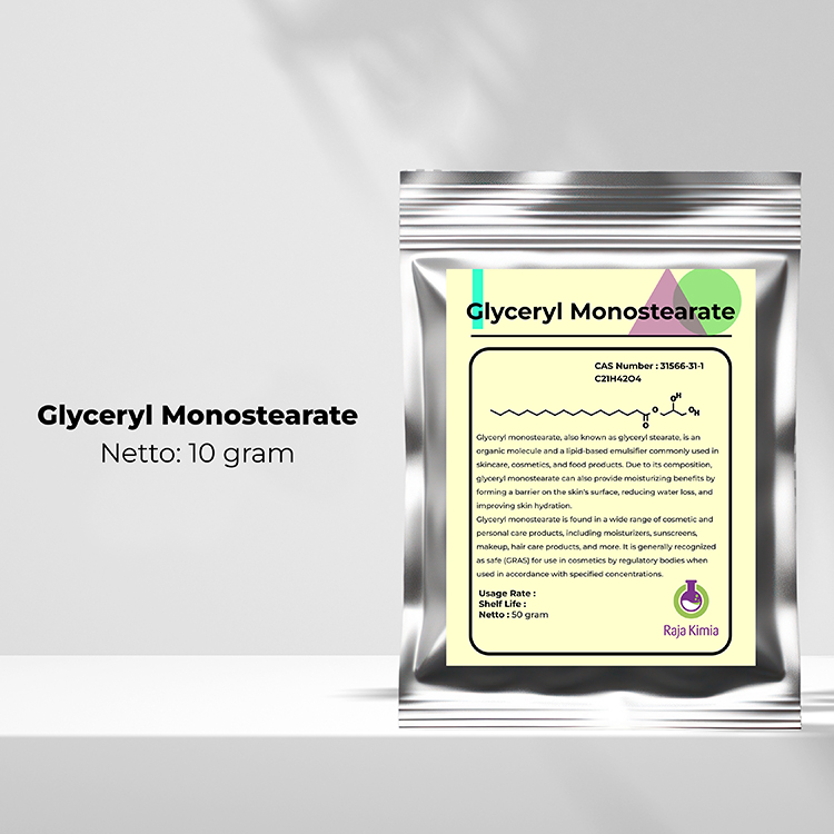 Glyceryl Monostearate (GMS) adalah ester dari gliserol dan asam stearat, digunakan luas sebagai emulsi, pengental, dan stabilizer dalam industri kosmetik, farmasi, dan pangan. GMS bersifat aman, stabil, dan multifungsi, sehingga menjadi bahan andalan untuk berbagai formulasi produk.